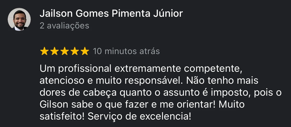 Ao escolher a Gilson Serviços Contábeis, você não contrata apenas um serviço, mas sim um profissional com 100% de aprovação dos clientes e, agora, oficialmente premiado como um dos melhores contadores de Mauá-SP. Esse reconhecimento atesta o alto padrão de excelência e a confiabilidade de nosso trabalho.