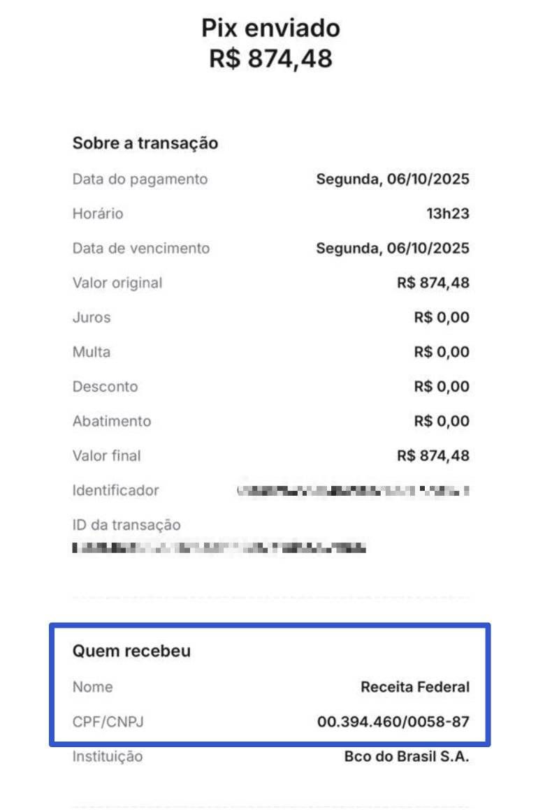 O Ponto Crítico: O QR Code gerado não direciona o pagamento para a Receita Federal, que é a recebedora oficial (CNPJ: 00.394.460/0058-87).